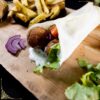 Shawarma de Falafel (con papas) Una receta de Shawarma hecho con falafel, acompañado de lechuga, tomate, cebolla morada y salsa de yogurt griego + PORCIÓN PAPAS RÚSTICAS |